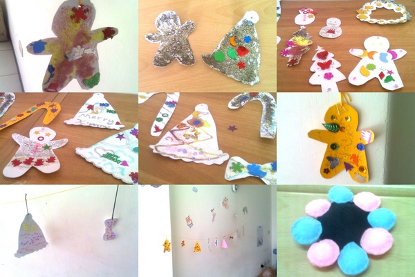 就只是上面那些作品(真的!) 西卡紙剪出形,再貼上亮片或亮粉或香豆 (紙型我也都先剪好讓他們描)