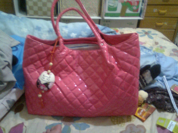豬吊飾是我媽吃品田牧場換的(換還送的!?) 把包放在床上要拍照的時候