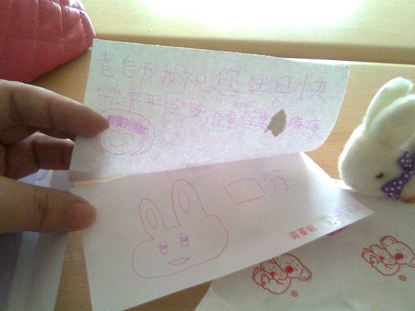 沒有另外去買卡片, 用白色空白紙+膠帶自己做的, 很童真~還畫了一個格子要我評分![]()