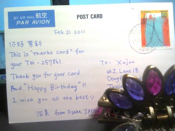電腦隨機選擇我寄卡給她, 她看了我網頁上的自介知道我想收到生日祝福